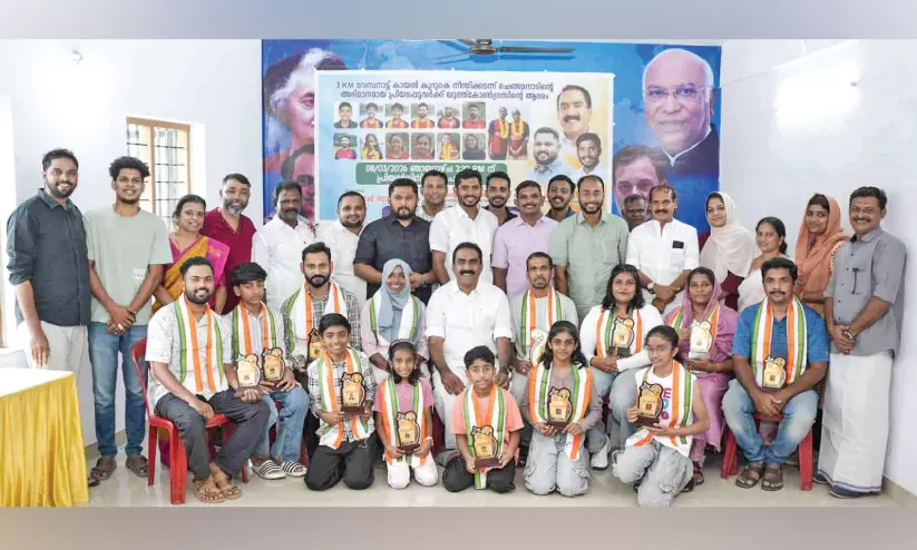 ചെങ്ങമനാട്: വേമ്പനാട്ടുകായലിലെ ആഴക്കയങ്ങളിൽ മൂന്ന് കി.മീ. ദൂരം നീന്തിക്കയറിയ ചെങ്ങമനാട് ഗ്രാമപഞ്ചായത്തിലെ 14 പ്രതിഭകളെ യൂത്ത് കോൺഗ്രസ് ചെങ്ങമനാട് മണ്ഡലം കമ്മിറ്റി ആദരിച്ചു. അൻവർ സാദത്ത് എം.എൽ.എ ഉദ്ഘാടനം ചെയ്തു. യൂത്ത് കോൺഗ്രസ് സംസ്ഥാന ജനറൽ സെക്രട്ടറി എ.എ. അബ്ദുൽ റഷീദ് മുഖ്യാതിഥിയായിരുന്നു. യൂത്ത് കോൺഗ്രസ് ചെങ്ങമനാട് മണ്ഡലം പ്രസിഡന്റ് സിറാജുദ്ദീൻ ഹക്കീം അധ്യക്ഷതവഹിച്ചു.