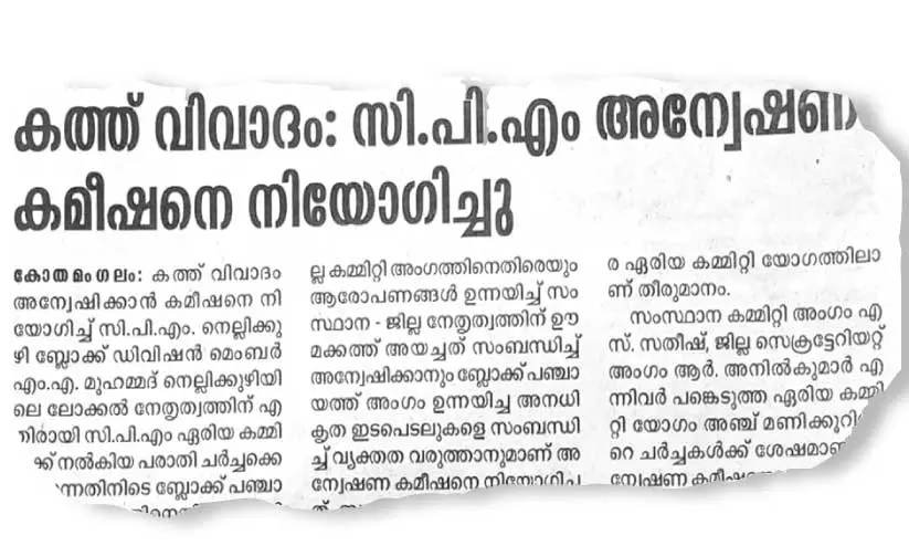 text_fieldsകോതമംഗലം: സി.പി.എമ്മിലെ കത്ത് വിവാദത്തിൽ ഏരിയ കമ്മിറ്റി അംഗവും നെല്ലിക്കുഴി പഞ്ചായത്ത് പ്രസിഡന്റുമായ പി.എം. മജീദിന് പാർട്ടിയുടെ താക്കീത്. ഒന്നര വർഷത്തിന് ശേഷമാണ് പാർട്ടി ഏരിയ കമ്മിറ്റി നിയോഗിച്ച അന്വേഷണ കമീഷൻ കഴിഞ്ഞദിവസം ലോക്കൽ കമ്മിറ്റി യോഗത്തിൽ റിപ്പോർട്ട് അവതരിപ്പിച്ചത്. നെല്ലിക്കുഴി സൗത്ത് ലോക്കൽ കമ്മിറ്റിയും നെല്ലിക്കുഴി ബ്ലോക്ക് ഡിവിഷൻ അംഗം എം.എ. മുഹമ്മദും പ്രസിഡന്റിനെതിരെ ഏരിയ കമ്മിറ്റിക്ക് നൽകിയ പരാതി ചർച്ചക്കെടുക്കുന്നതിനിടെ ബ്ലോക്ക് പഞ്ചായത്ത് അംഗത്തിനെതിരെയും ജില്ല കമ്മിറ്റി അംഗത്തിനെതിരെയും ആരോപണങ്ങൾ ഉന്നയിച്ച് സംസ്ഥാന - ജില്ല നേതൃത്വങ്ങൾക്ക് ഊമക്കത്ത് അയച്ചത് സംബന്ധിച്ച് അന്വേഷിക്കാൻ 2023 ജനുവരി അവസാനവാരം ചേർന്ന ഏരിയ കമ്മിറ്റി യോഗമാണ് അന്വേഷണ കമീഷനെ നിയോഗിച്ചത്.