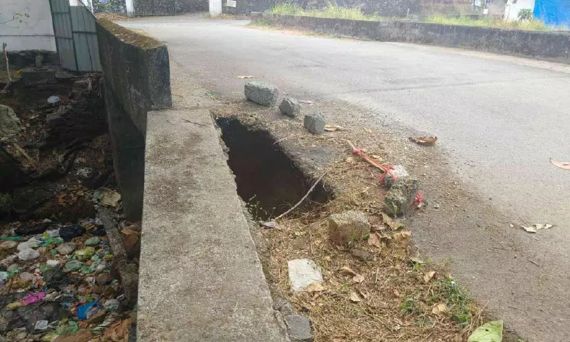 റോഡ് ഇടിഞ്ഞ് ഒരാഴ്ച പിന്നിട്ടിട്ടും ഇഷ്ടിക വച്ച് മുന്നറിയിപ്പ് നൽകിയിരിക്കുന്നതല്ലാതെ അപകട സാഹചര്യം ഒഴിവാക്കാൻ നടപടിയുണ്ടായിട്ടില്ല.