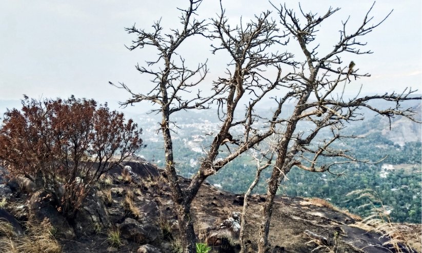text_fieldsകുന്തളംപാറ മലമുകളിൽ ഉണ്ടായ കാട്ടുതീയിൽ ഉണങ്ങിയ മരങ്ങൾ