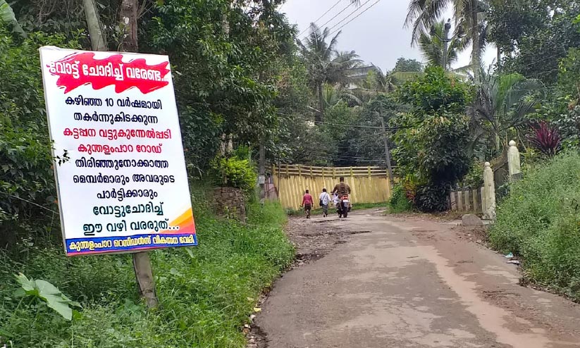 നഗരസഭയിലെ കുന്തളംപാറ 18, 19 വാർഡുകാരാണ് തെരഞ്ഞെടുപ്പിന് മുമ്പേ നിലപാട് വ്യക്തമാക്കുന്നത്. വർഷങ്ങളായി തകർന്നുകിടക്കുന്ന വട്ടുകുന്നേൽപടി-കുന്തളംപാറ റോഡ് പുനർനിർമിക്കാൻ കൗൺസിലർമാർ ചെറുവിരലനക്കിയില്ലെന്നാണ് പരാതി. നാട്ടുകാർ നിരവധി ബോർഡുകളാണ് സ്ഥാപിച്ചത്.