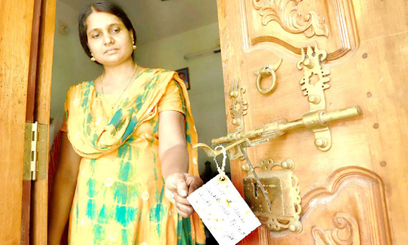 text_fieldsവാതിലിനു പുറത്ത് കണ്ടെത്തിയ എഴുത്ത് കാണിക്കുന്ന ഗൃഹനാഥ