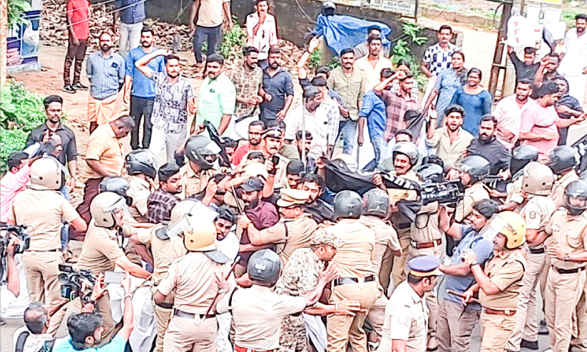 എസ്.എഫ്.ഐ പ്രവർത്തകരെ പൊലീസ് തടയുന്നു