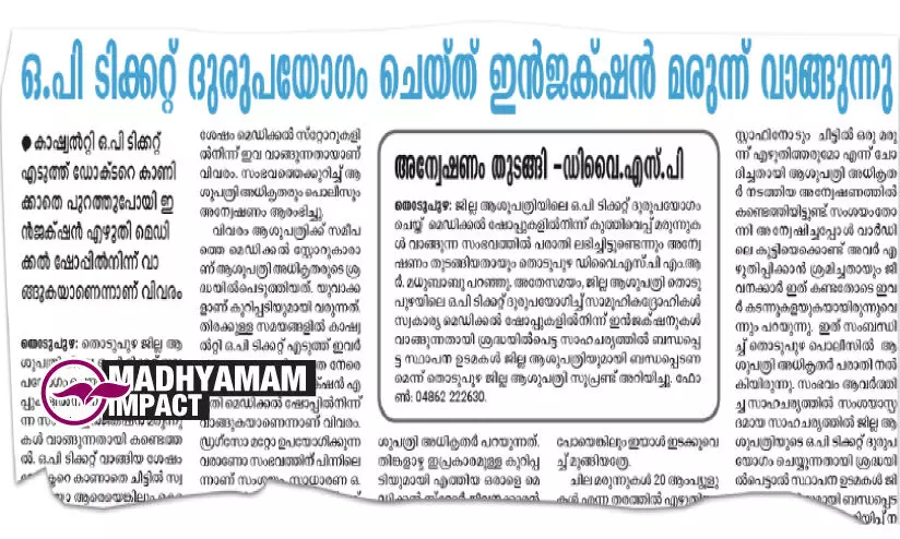 text_fieldsതൊടുപുഴ: തൊടുപുഴ ജില്ല ആശുപത്രിയിലെ ഒ.പി ടിക്കറ്റുകൾ ദുരുപയോഗം ചെയ്ത് ഇഞ്ചക്ഷൻ മരുന്നുകളടക്കം വാങ്ങുന്ന സംഭവത്തിൽ ആരോഗ്യ വകുപ്പ് ഇടപെടുന്നു. ഇതുസംബന്ധിച്ച അന്വേഷണത്തിന് ഹെൽത്ത് ഇൻസ്പെക്ടർമാരെ ചുമതലപ്പെടുത്തിയതായി ഡി.എം.ഒ ഡോ. മാനോജ് പറഞ്ഞു. ഒ.പി ചീട്ടുകളുടെ ദുരുപയോഗം സംബന്ധിച്ച ‘മാധ്യമം’ വാർത്തയെ തുടർന്നാണ് നടപടി. തൊടുപുഴ പൊലീസും വിഷയത്തിൽ അന്വേഷണം തുടങ്ങി. ജില്ലയിലെ ആശുപത്രികൾ കേന്ദ്രീകരിച്ച് ഇത്തരത്തിലുള്ള സംഭവങ്ങൾ നടന്നിട്ടുണ്ടോ എന്നതടക്കമുള്ള കാര്യങ്ങൾ പരിശോധിക്കുമെന്ന് തൊടുപുഴ ഡിവൈ.എസ്.പി ആർ. മധുബാബുവും ‘മാധ്യമ’ത്തോട് പറഞ്ഞു.