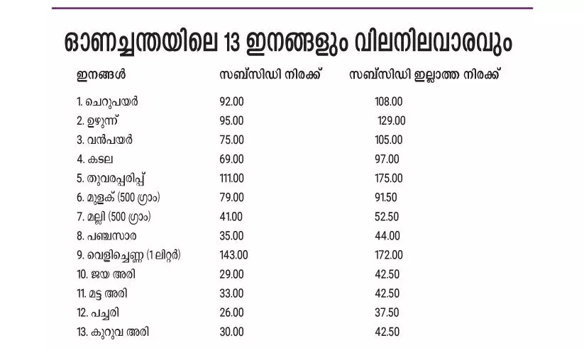 ചെറുപയർ, ഉഴുന്ന്, വൻപയർ, കടല, തുവരപ്പരിപ്പ്, മുളക്, മല്ലി, പഞ്ചസാര, വെളിച്ചെണ്ണ, ജയ അരി, മട്ട അരി, പച്ചരി, കുറുവ അരി എന്നിവയാണ് സബ്സിഡി നിരക്കിൽ ലഭിക്കുക.