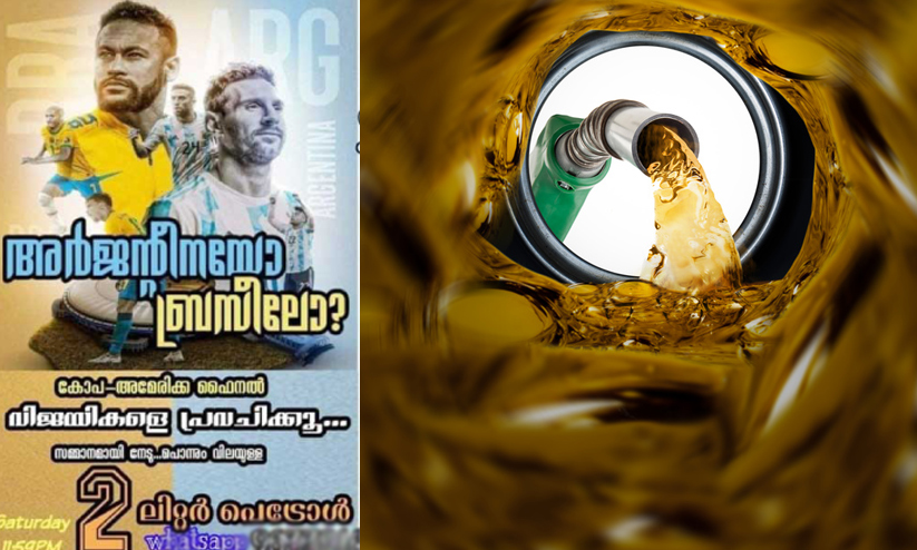 text_fieldsകണ്ണൂർ: കോപ അമേരിക്ക, യൂറോ കപ്പ് ഫുട്ബാൾ ടൂർണമെൻറിലെ വിജയി ആരാണെന്ന് പറയുന്നവരെ കാത്തിരിക്കുന്നത് പൊന്നും വിലയുള്ള പെട്രോൾ. യൂത്ത് കോൺഗ്രസ് നാറാത്ത് മണ്ഡലം കമ്മിറ്റി, കോറളായി പ്രിയദർശിനി യൂത്ത് സെൻറർ എന്നിവയാണ് പ്രതിഷേധവും കൗതുകവും നിറഞ്ഞ പ്രവചന മത്സരവുമായി എത്തിയത്.