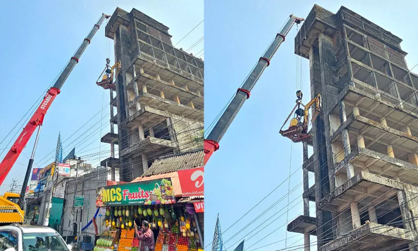 text_fieldsവർഷങ്ങളായി പാതിവഴിയിൽ നിർമാണം നിലച്ച കാൾടെക്സ് ജങ്ഷനിലെ കെട്ടിടം പൊളിക്കാൻ കൂറ്റൻ ക്രെയിൻ ഉപയോഗിച്ച് ചെറിയ ക്രെയിൻ മുകളിലേക്ക് കയറ്റുന്നു
