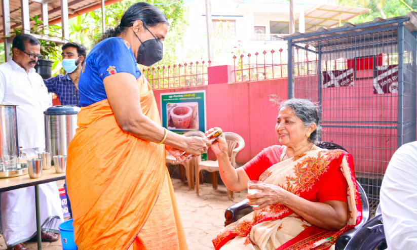 text_fieldsപിണറായി ഗ്രാമപഞ്ചായത്ത് ഓഫിസിൽ വിവിധ ആവശ്യങ്ങൾക്കെത്തിയവർക്ക് ചായയും പലഹാരവും നൽകുന്നു