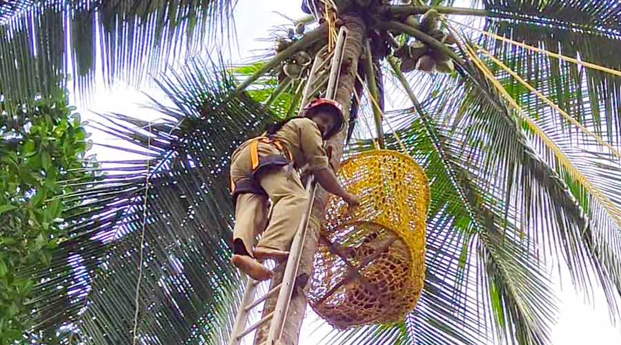 തെങ്ങിൽ കുടുങ്ങിയ ഷിജുവിനെ സുരക്ഷാവല ഉപയോഗിച്ച് അഗ്നിശമനസേന താഴെയിറക്കുന്നു