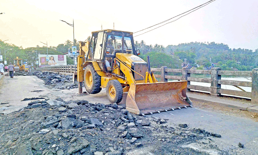text_fieldsമാഹിപ്പാലത്തിന്റെ ഉപരിതലത്തിലുള്ള ടാറുകൾ മണ്ണുമാന്തി യന്ത്രം ഉപയോഗിച്ച് ഇളക്കി മാറ്റുന്നു