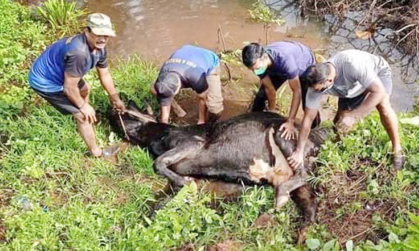 തട്ടാർകടവ് പുഴയിലാണ് ഫയർഫോഴ്സ് സാധാരണ പരിശീലനത്തിന് പോകാറുള്ളത്. എന്നാൽ, ഇന്നലെ വഴിയൊന്ന് മാറ്റിപ്പിടിക്കുകയായിരുന്നു. പയ്യന്നൂർ ശാന്തി തിയറ്ററിന് മുൻവശെത്ത ദേശീയപാതയോരത്തെ ചളിക്കുഴിയിൽ ഒരു പശു വീണുകിടക്കുന്നത് വാഹനത്തിലുണ്ടായിരുന്ന ഫയർ ആൻഡ് റെസ്ക്യൂ ഓഫിസർ കെ. വിശാലിെൻറ ശ്രദ്ധയിൽ യാദൃച്ഛികമായി പെടുകയായിരുന്നു. അദ്ദേഹം വാഹനത്തിൽ ഉണ്ടായിരുന്ന മറ്റുള്ളവരെ വിവരമറിയിച്ചു. സേനാംഗങ്ങൾ സംഭവസ്ഥലത്തേക്ക് പാഞ്ഞെത്തിയപ്പോൾ ശ്വാസമെടുക്കാൻ ബുദ്ധിമുട്ടി പിടയുന്ന പശുവിനെയാണ് കണ്ടത്.
