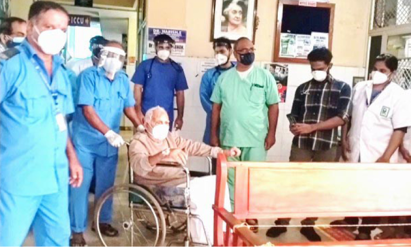 നൂറ്റിയൊന്നാം വയസ്സില് പിടികൂടിയ കോവിഡില്നിന്നും രക്ഷപ്പെടുത്തിയ ഡോക്ടര്മാരോടും മറ്റ് ആശുപത്രി ജീവനക്കാരോടും കൈകൂപ്പി നന്ദിപറഞ്ഞാണ് കരുണാകരനും കൂടെയുണ്ടായിരുന്ന മകൾ ഭാനുമതിയും വീട്ടിലേക്ക് തിരിച്ചത്. ആശുപത്രി ജീവനക്കാര് സ്നേഹോപഹാരം നല്കിയാണ് ഇദ്ദേഹത്തെ യാത്രയാക്കിയത്.