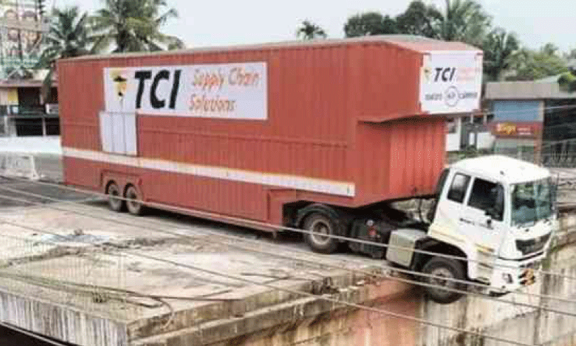 text_fieldsകണ്ടെയ്നർ ലോറിയുടെ കാബിൻ പാലത്തിൽ കുടുങ്ങിയ നിലയിൽ