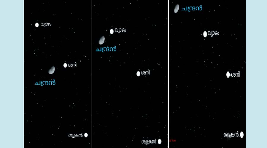 പയ്യന്നൂർ: വ്യാഴാഴ്ച മുതൽ മൂന്നുനാൾ കാണാം ഗ്രഹങ്ങൾക്കിടയിലൂടെ ചന്ദ്രെൻറ യാത്ര. വ്യാഴാഴ്ച മുതൽ ശനിവരെ വ്യാഴം, ശനി, ശുക്രൻ എന്നീ ഗ്രഹങ്ങളോടൊപ്പമായിരിക്കും ഭൂമിയുടെ ഉപഗ്രഹമായ ചന്ദ്രെൻറ ഇടം. രസകരമായ ഈ കാഴ്ച രാത്രി ഏഴുമുതൽ 8.30 വരെയായിരിക്കും കാണാനാവുക.