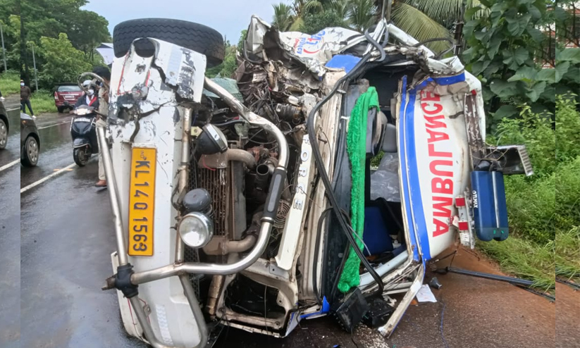 ഷാർജയിൽ മരിച്ച ഉദുമ സ്വദേശി സുധീഷിന്റെ മൃതദേഹം ഇന്ന് പുലർച്ചെ 3.40നാണ് അവിടെനിന്ന് കണ്ണൂരിലേക്ക് കൊണ്ടുവന്നത്. കണ്ണൂർ വിമാനത്താവളത്തിൽ നിന്ന് വീട്ടിലേക്ക് കൊണ്ടുപോകുന്നതിനിടെയായിരുന്നു അപകടം. എതിരെ വരികയായിരുന്ന പിക്കപ്പ് വാനും കാറുമായി കൂട്ടിയിടിച്ച് ആംബുലൻസ് കീഴ്മേൽ മറിഞ്ഞു.