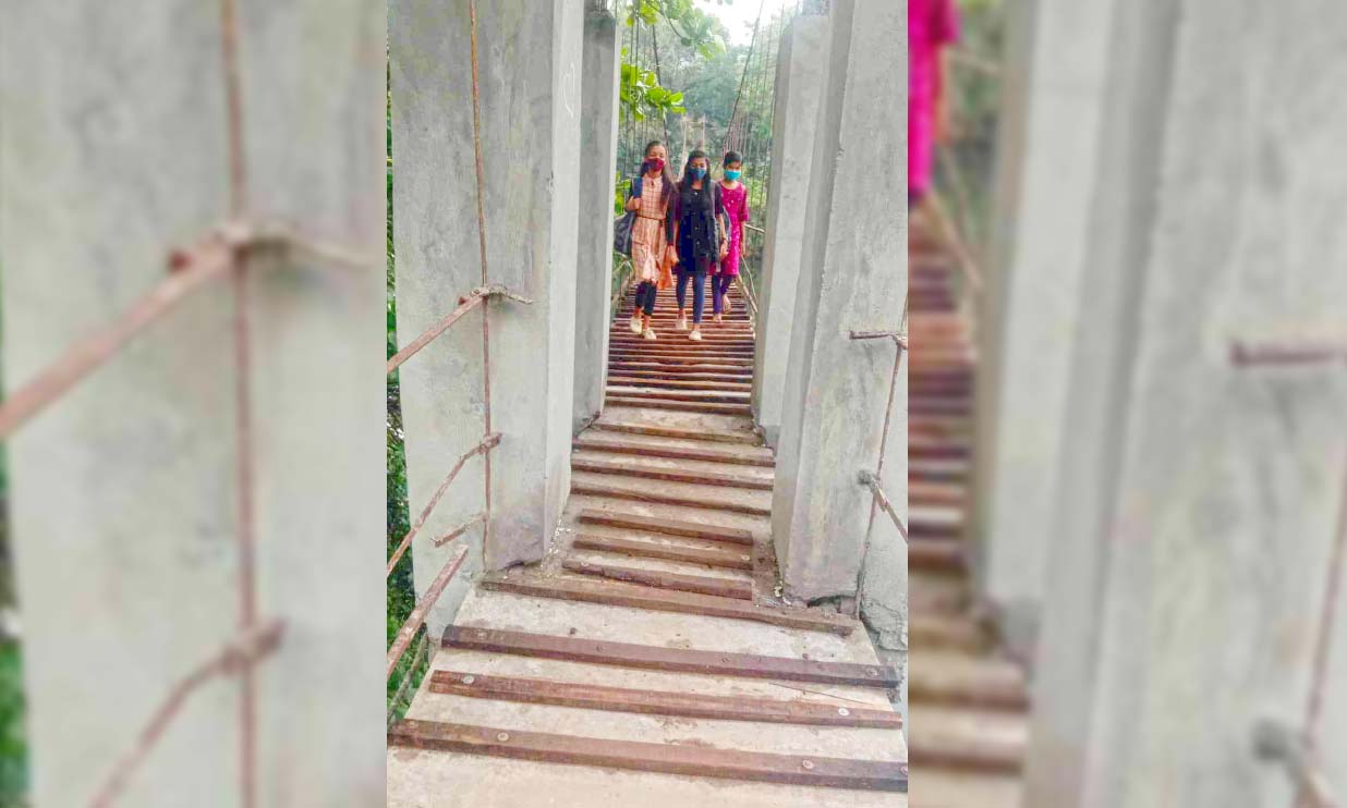 text_fieldsബലപ്പെടുത്തിയ അലക്സ് നഗർ തൂക്കുപാലത്തിലൂടെ കുട്ടികൾ കടന്നുപോകുന്നു