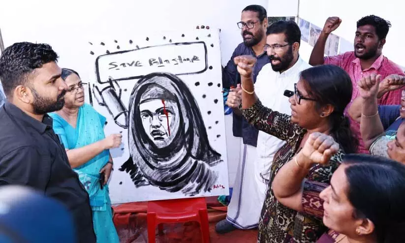 കണ്ണൂർ: ഫലസ്തീൻ ജനതക്കുനേരെ ഇസ്രയേൽ നടത്തുന്ന കടന്നാക്രമണത്തിന്റെ നേർച്ചിത്രവുമായി ചിത്രപ്രദർശനം. ‘സ്റ്റോപ് വാർ’ എന്ന പേരിൽ യുദ്ധത്തിനെതിരെ എസ്.എഫ്.ഐ നേതൃത്വത്തിലാണ് സ്റ്റേഡിയം കോർണറിൽ പ്രദർശനം നടത്തിയത്. കണ്ണൂരിൽ ജനാധിപത്യ മഹിള അസോസിയേഷൻ, ഡി.വൈ.എഫ്.ഐ, എസ്.എഫ്.ഐ നേതൃത്വത്തിൽ ബുധനാഴ്ച നടത്തുന്ന ഫലസ്തീൻ ഐക്യദാർഢ്യ റാലിയുടെ പ്രചാരണാർഥമാണ് ചിത്രപ്രദർശനവും ചിത്രകാര കൂട്ടായ്മയും സംഘടിപ്പിച്ചത്.