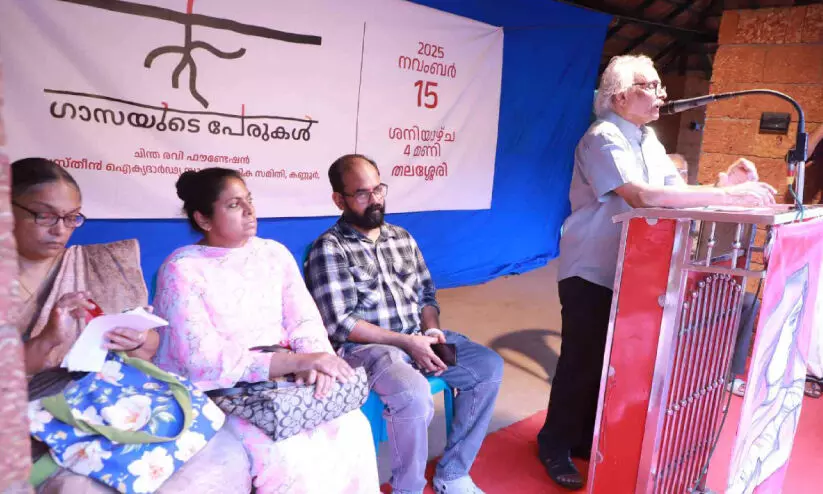 'ഗസ്സയുടെ പേരുകൾ' ഫലസ്തീൻ ഐക്യദാർഢ്യ കൂട്ടായ്മ തലശ്ശേരിയിൽ നടന്നു. ചിന്ത രവി ഫൗണ്ടേഷന്റെ നേതൃത്വത്തിൽ സംസ്ഥാന വ്യാപകമായി നടക്കുന്ന പ്രതിഷേധ കൂട്ടായ്മയുടെ ഭാഗമായാണ് പരിപാടി. കസ്റ്റംസ് റോഡിലെ ഓപൺ സ്റ്റേജിൽ എഴുത്തുകാരൻ എം. മുകുന്ദൻ ഉദ്ഘാടനം ചെയ്തു. പ്രഫ. എ.പി. സുബൈർ അധ്യക്ഷത വഹിച്ചു. എസ്. സിതാര, സി.കെ. രമേശൻ, കാരായി രാജൻ, ഡോ. എ. വത്സലൻ, പ്രിയ വർഗീസ്, സുധ അഴീക്കോടൻ, പ്രഫ. എൻ. സുഗതൻ, അഡ്വ. ജഗദാബായ് എന്നിവർ സംസാരിച്ചു. സീതാനാഥ് സ്വാഗതം പറഞ്ഞു.