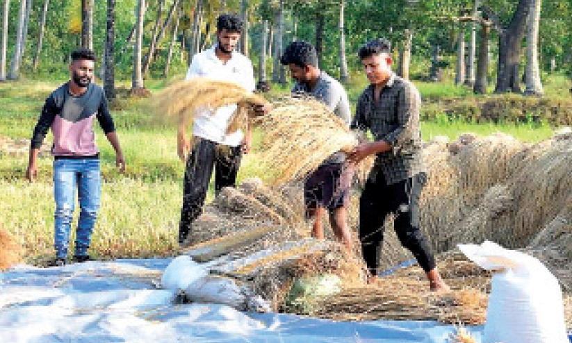 text_fieldsപിലിക്കോട് കണ്ണങ്കൈയിലെ കെ.വി. രവീന്ദ്രന്റെ വയലിൽ കൊയ്ത്തും മെതിയും നടത്തുന്ന യുവാക്കൾ