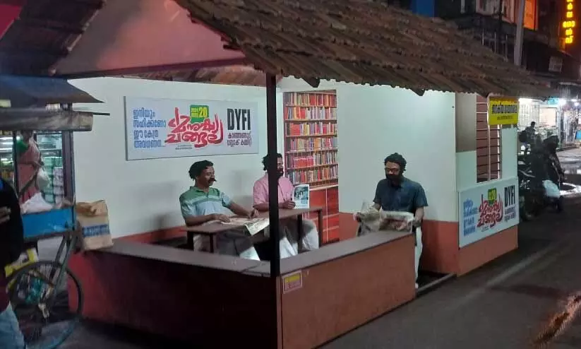 കാഞ്ഞങ്ങാട് ബസ് സ്റ്റാൻഡിന് മുൻവശത്ത് ഷെഡ് സ്ഥാപിച്ച് ഡി.വൈ.എഫ്.ഐ; വിവാദമായി പ്രതീകാത്മക വായനശാല