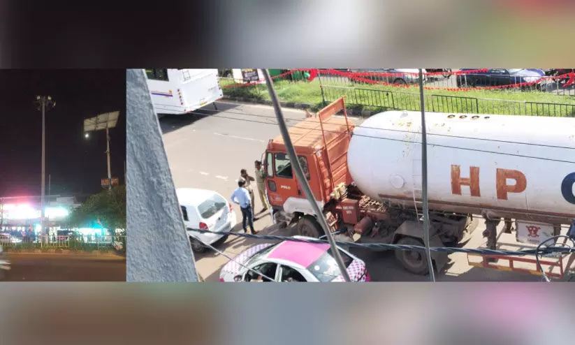 ആളുകൾ കടക്കുന്നതിനിടെ സീബ്രാലൈൻ കയറിയ ടാങ്കർ ലോറി ഹോം ഗാർഡ് തടയുന്നു