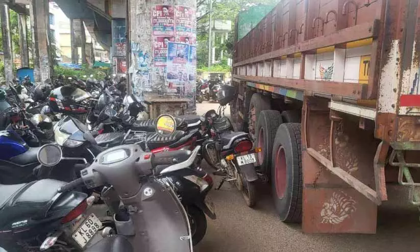 റെയിൽവേ സ്റ്റേഷൻ റോഡിലെ ബൈക്ക് പാർക്കിങ്: ലോറി കുടുങ്ങി