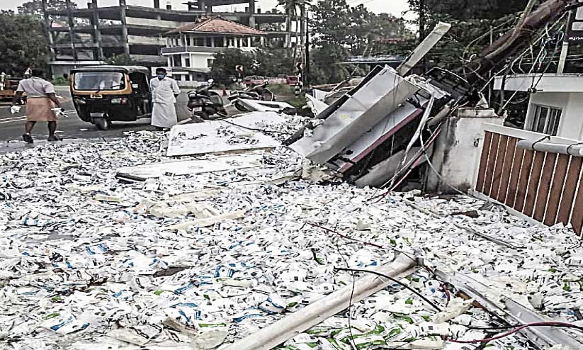 നിയന്ത്രണംവിട്ട പാൽ ലോറി മറിഞ്ഞു; 20,000 ലിറ്റർ പാൽ, തൈര് പാക്കറ്റുകൾ റോഡിൽ
