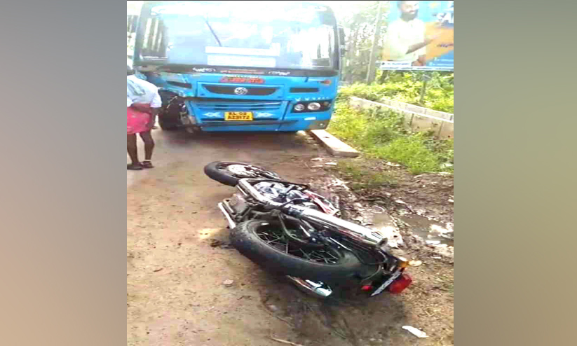 കഴിഞ്ഞ ദിവസമുണ്ടായ അപകടത്തിൽപെട്ട യാത്രാ ബസും ബൈക്കും. ബൈക് യാത്രികൻ സംഭവസ്ഥലത്ത് മരിച്ചു