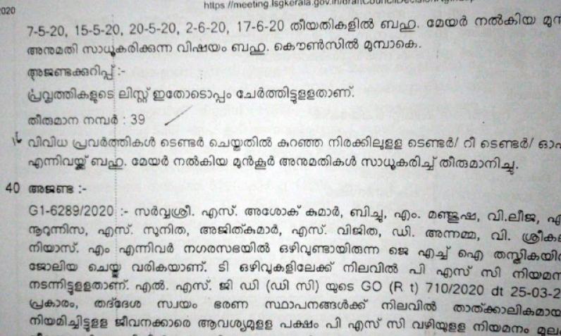 സെക്രട്ടറി നിയോഗിക്കുന്ന ഉദ്യോഗസ്ഥനാണ് മിനിറ്റ്സ് തയാറാക്കുന്നത്. കരട് മിനറ്റ്സ് ആദ്യം തയാറാക്കി മേയർ പരിശോധനക്ക് നൽകണം. അത് മേയർ പരിശോധിച്ച് കൗൺസിൽ തീരുമാനപ്രകാരമുള്ള തിരുത്തലുകൾ വരുത്തിയോ അല്ലാതെയോ മടക്കി നൽകി അന്തിമ മിനിറ്റ്സ് തയാറാക്കണമെന്നാണ് മുനിസിപ്പൽ ആക്ടിൽ പറയുന്നത്. പേക്ഷ, കൗൺസിൽ തീരുമാനത്തിന് വിരുദ്ധമായ തിരുത്തലാണ് കരട് മിനിറ്റ്സിൽ വരുത്തിയത്.വാർഷികപദ്ധതിയിൽ നിന്നാണ് ഉപാസന ആശുപത്രിക്ക് സമീപത്തെ ചുറ്റുമതിൽ നിർമാണത്തിനുള്ള പണം വകയിരുത്തിയിരുന്നത്. പിന്നീട് കേന്ദ്ര ഗ്രാൻറിലെ കുറവിനും സുഭിക്ഷ പദ്ധതിക്ക് പണം വകയിരുത്താനുമായി വാർഷിക പദ്ധതി ഭേദഗതി ചെയ്തു. ഇങ്ങനെ ഭേദഗതി ചെയ്ത പദ്ധതിയിലും മതിൽ ചുറ്റുമതിൽ നിർമാണം ഉൾപ്പെട്ടിരുന്നു. ഇത് കൗൺസിൽ യോഗത്തിൽ െവച്ച് അംഗീകരിച്ചതുമാണ്. എന്നാൽ ജില്ല ആസൂത്രണസമിതിക്ക് സമർപ്പിക്കുന്നതിന് മുമ്പ് മതിൽ നിർമാണ പദ്ധതി രഹസ്യമായി ഒഴിവാക്കുകയായിരുന്നു