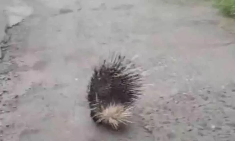 മഴവെള്ളപാച്ചിലിൽ മുള്ളൻപന്നി ഒഴുകിയെത്തി