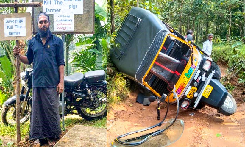 text_fields1. ഷജീർ പ്ലക്കാർഡ് പിടിച്ച് പ്രതിഷേധിക്കുന്നു 2. കുളത്തൂപ്പുഴ പെരുവഴിക്കാലയിലേക്കുള്ള വനപാതയില് കാട്ടാന കുത്തിമറിച്ച ഓട്ടോ