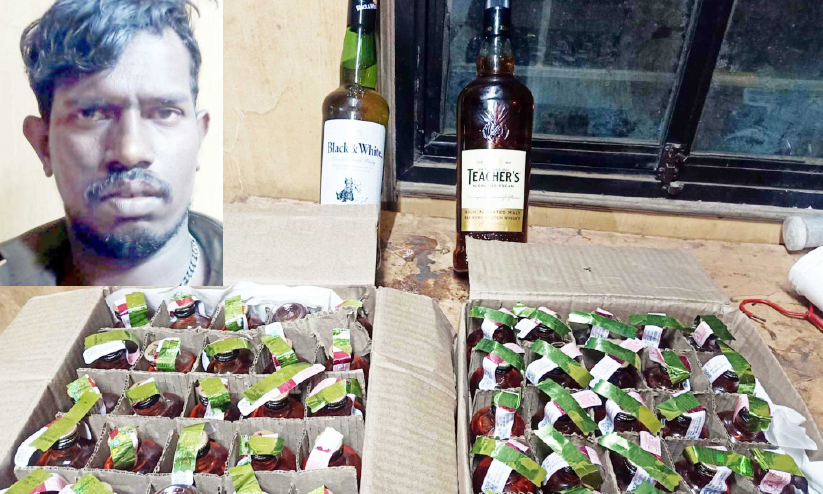 text_fieldsപിടികൂടിയ പുതുച്ചേരി മദ്യം, ഇൻസെറ്റിൽ സുധാകർ