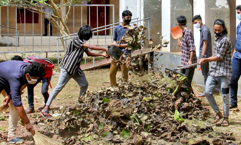 text_fieldsസ്കൂളുകൾ തുറക്കുന്നതിന് മുന്നോടിയായി എൻ.എസ്.എസ് വളണ്ടിയർമാരുടെ നേതൃത്വത്തിൽ സ്കൂൾ പരിസരം വൃത്തിയാക്കുന്നു. കൊല്ലം ബോയ്സ് എച്ച്.എസ്.എസിൽനിന്നുള്ള കാഴ്ച