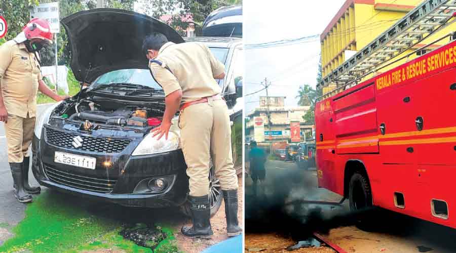 1. കൊല്ലം ക്യു.എസ് റോഡിൽ സി.എസ്.ഐ കൺവെൻഷൻ സെൻററിന് സമീപം ഓടിക്കൊണ്ടിരിക്കെ പുക ഉയർന്ന കാർ അഗ്നിശമനസേനാംഗങ്ങൾ പരിശോധിക്കുന്നു. 2. രക്ഷാപ്രവർത്തനത്തിനിടെ അഗ്നിശമനസേനാ വാഹനത്തിൽനിന്ന് കറുത്ത പുക ഉയരുന്നു