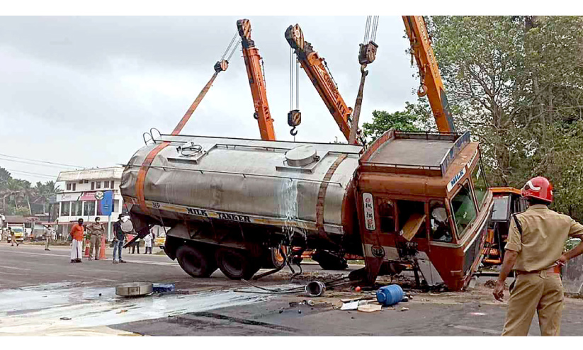 പാലുമായി വന്ന ടാങ്കർ ലോറി ഡിവൈഡറിൽ ഇടിച്ചുമറിഞ്ഞു