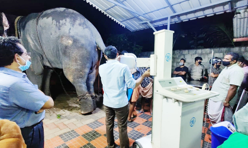 ആദ്യമായാണ് സ്വകാര്യ വെറ്ററിനറി ആശുപത്രിയിൽ ഇത്തരം പരിശോധന. കമ്പ്യൂട്ടറൈസ്ഡ് ഡിജിറ്റൽ എക്സ്റേ മൊബൈൽ യൂനിറ്റ് ഉപയോഗിച്ചാണ് റിട്ട. ചീഫ് വെറ്ററിനറി ഡോക്ടർ കെ. ഉണ്ണികൃഷ്ണെൻറ നേതൃത്വത്തിൽ എക്സ്റേ എടുത്തത്. കാറിടിച്ചതിനെത്തുടർന്ന് വാലിൽ ഏറ്റ പരിക്ക് നീർക്കെട്ടായതാണെന്നും എല്ലിന് ചെറിയ പൊട്ടൽ ഉണ്ടായതായും പരിശോധനയിൽ കണ്ടെത്തി. തുടർന്ന് ആനയുടെ വാലിൽ പ്ലാസ്റ്റർ ഇട്ടു.