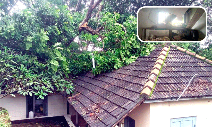 text_fieldsകോട്ടയം ജില്ല ആശുപത്രിയിൽ മോർച്ചറി കെട്ടിടത്തിനുമുകളിൽ മരം വീണപ്പോൾ. ഇൻസെറ്റിൽ മോർച്ചറിയുടെ ഉൾവശം