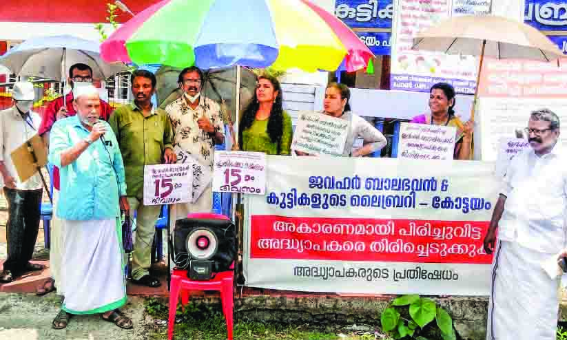 കോട്ടയം: ജവഹർ ബാലഭവനെ പബ്ലിക് ലൈബ്രറിയിൽനിന്ന് പുറത്താക്കാനുള്ള നീക്കത്തിനെതിരെയും അധ്യാപകരെ പിരിച്ചുവിട്ടതിൽ പ്രതിഷേധിച്ചും ബാലഭവൻ അധ്യാപകർ നടത്തുന്ന സമരം 16ആം ദിവസത്തിലേക്ക്. ഹാർമോണിയം, ഓർഗൻ അധ്യാപകൻ പി.ജി. ഗോപാലകൃഷ്ണൻ, ചിത്രകല അധ്യാപകൻ ചെങ്ങളം ഹരിദാസ് എന്നിവരെയാണ് പബ്ലിക് ലൈബ്രറിയെ അപകീർത്തിപ്പെടുത്തി, വൈസ് ചെയർമാനെ ധിക്കരിച്ചു എന്നീ കാരണങ്ങൾ കാട്ടി പിരിച്ചുവിട്ടത്. ലൈബ്രറിക്കെതിരെ വാർത്തസമ്മേളനത്തിൽ സംസാരിച്ചവരാണ് ഇവർ. ഇതിനെതിരെ എല്ലാ അധ്യാപകരും ക്ലാസ് ബഹിഷ്കരിച്ചാണ് രാവിലെ മുതൽ ഉച്ച വരെ സമരം നടത്തുന്നത്.