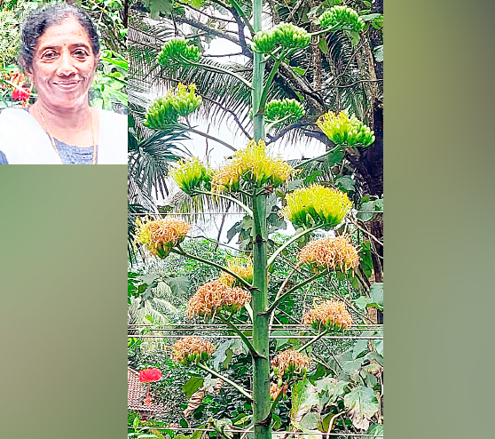ഉദ്യാന പരിപാലനം ഇഷ്ടപ്പെടുന്ന നിർമലക്ക് കുമളി സ്വദേശിയായ കൂട്ടുകാരി സമ്മാനമായി എട്ടുവർഷം മുമ്പ് നൽകിയതാണ് അഗേവ് സിസലാന തൈ. മധ്യ അമേരിക്കയിൽ കാണുന്ന ഈ ചെടി വിദേശ അധിനിവേശ സമയത്ത് ഇന്ത്യയിലെത്തിയതാണെന്ന് കരുതുന്നു. തണുപ്പുള്ള പ്രദേശത്താണ് സാധാരണയായി ചെടി വളരുന്നത്. പൂക്കൾ ദിവസങ്ങളോളം നിലനിൽക്കും. പിന്നീട് കായ്കളായി മാറിയശേഷം മുളന്തണ്ടുകൾ ഉൾപ്പെടെ നശിച്ചുപോകും.