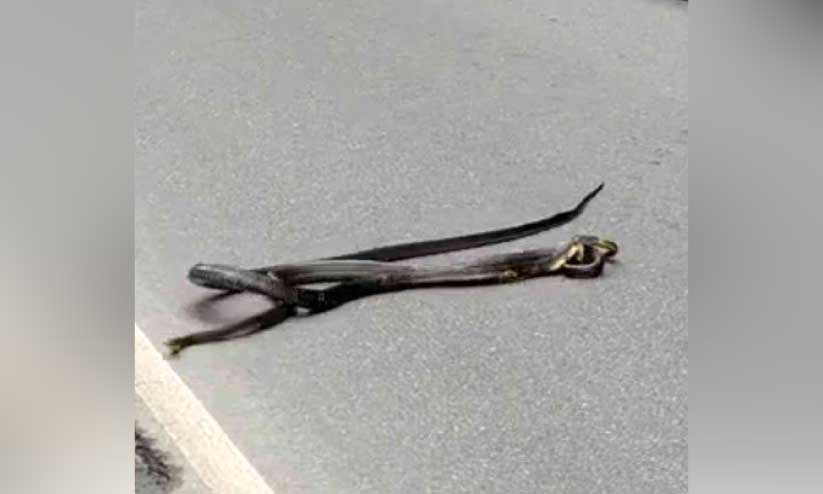 text_fieldsദേശീയപാതയിൽ രാജവെമ്പാല ചേരയെ വിഴുങ്ങുന്നു