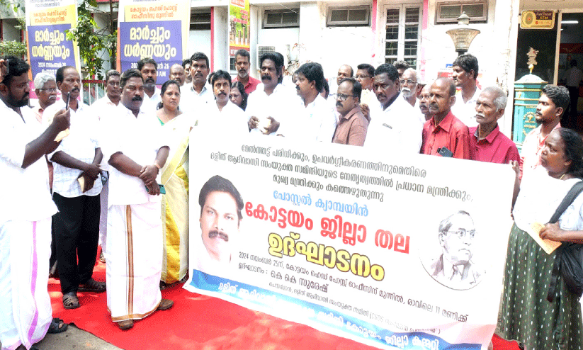 ഹെഡ് പോസ്റ്റ് ഓഫിസിന് മുന്നിൽ നടന്ന ജില്ലതല ഉദ്ഘാടനം ദലിത് ആദിവാസി സംയുക്ത സമിതി ചെയർമാനും സി.എസ്.ഡി.എസ് സംസ്ഥാന പ്രസിഡന്റുമായ കെ.കെ. സുരേഷ് ഉദ്ഘാടനം ചെയ്തു. സമിതി ജില്ല ചെയർമാൻ പ്രവീൺ വി.ജയിംസ് അധ്യക്ഷതവഹിച്ചു. കൺവീനർ മനോജ് കൊട്ടാരം, അഡ്വ.എ. സനീഷ് കുമാർ, അജയ് കോട്ടയം, ഇ.ജി. സജീവ്, വിനു ബേബി, ജയമോൻ പുത്തൻതോട്, അരുൺ സംക്രാന്തി, പ്രസാദ് കാളിച്ചിറ, പ്രവീൺ കെ. കുമാർ, ശ്രീജിനി സജീവ്, അജിത്ത് കല്ലറ, ആഷ്ലി ബാബു തുടങ്ങിയവർ സംസാരിച്ചു.