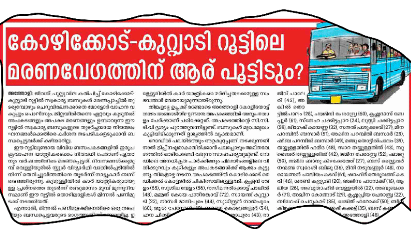 രണ്ടാഴ്ച മുമ്പ് അത്തോളി കുനിയിൽ കടവ് ജങ്ഷന് സമീപം കുറ്റ്യാടി റൂട്ടിൽ ഓടുന്ന സ്വകാര്യ ബസിടിച്ച് ഒരാൾ മരിച്ചിരുന്നു. കാൽനടക്കാരനായ കുനിയിൽ കടവ് കണിയാർ വയൽ വീട്ടിൽ ഇമ്പിച്ചി മമ്മുവാണ് (85) മരിച്ചത്. ഇക്കഴിഞ്ഞ ഒക്ടോബർ 14ന് ഉച്ചക്ക് രണ്ടുമണിയോടെ അത്തോളി കോളിയോട്ട് താഴം അങ്ങാടിയിൽ ഉണ്ടായ ബസ് അപകടത്തിൽ 60 ഓളം പേർക്ക് പരിക്കേറ്റിരുന്നു.