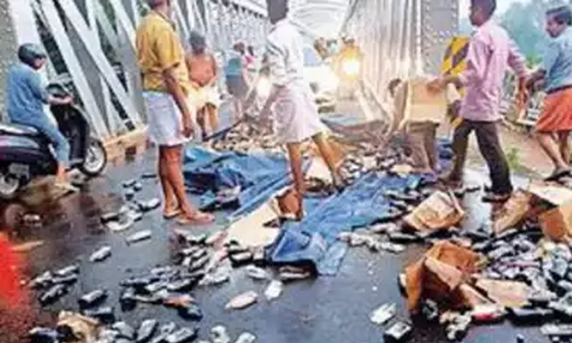 ചൊവ്വാഴ്ച രാവിലെ 6.30നാണ് പഞ്ചാബിൽനിന്ന് കൊല്ലത്തേക്ക് പോവുകയായിരുന്ന ലോറി പാലത്തിന്റെ ഫറോക്ക് ഭാഗത്തെ സുരക്ഷാകമാനത്തിൽ തട്ടി അമ്പതോളം കെയ്സ് മദ്യക്കുപ്പികൾ റോഡിൽ ചിതറിയിരുന്നത്. പിന്നാലെയെത്തിയ യാത്രക്കാർ അറിയിച്ചിട്ടും ലോറിക്കാർ നിർത്താതെ പോയി.