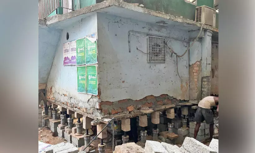 വെള്ളപ്പൊക്ക ഭീഷണി; കെട്ടിടം ജാക്കിവെച്ച് ഉയർത്തുന്നു