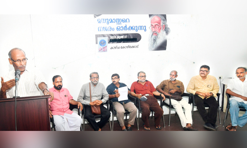 കോഴിക്കോട്: നാടകംകൊണ്ടും തിളച്ചുമറിഞ്ഞ രാഷ്ട്രീയംകൊണ്ടും കോഴിക്കോടിന്റെ സാമൂഹിക ബോധത്തിലെ ഒരുകാലത്തെ ഉഴുതുമറിച്ച മധു മാസ്റ്ററെ നഗരം ഒരിക്കൽകൂടി ഓർമിച്ചു. തീക്ഷ്ണമായ രാഷ്ട്രീയ സ്വപ്നങ്ങളിലേക്ക് ഒരുതലമുറയെ ആനയിച്ചതിൽ മധു മാസ്റ്റർ എന്ന കലാകാരൻ വഹിച്ച പങ്ക് 'കാഴ്ച'യുടെ ആഭിമുഖ്യത്തിൽ മാനാഞ്ചിറ സ്പോർട്സ് കൗൺസിൽ ഹാളിൽ നടന്ന സ്മരണയിൽ പങ്കുവെച്ചു. ഇക്കഴിഞ്ഞ മാർച്ച് 19നായിരുന്നു 74ാം വയസ്സിൽ കെ. മധുസൂദനൻ എന്ന മധു മാസ്റ്റർ അന്തരിച്ചത്.