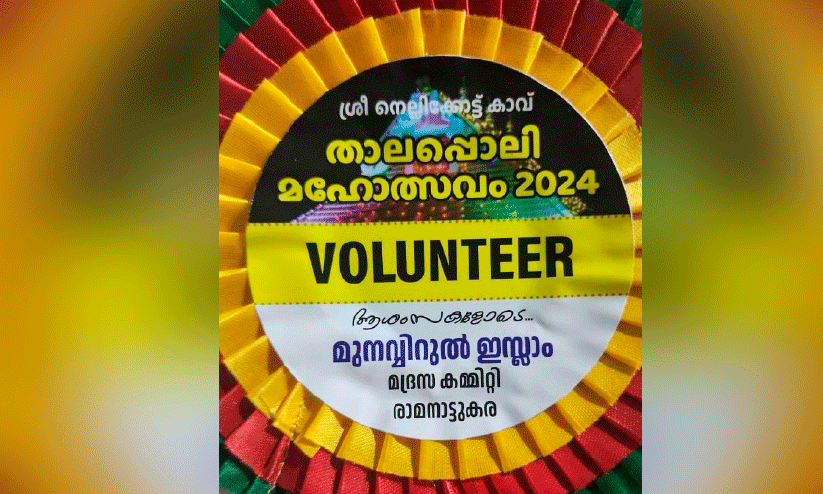 രാമനാട്ടുകര: ചരിത്രപ്രസിദ്ധമായ നെല്ലിക്കോട്ടുകാവ് താലപ്പൊലി മഹോത്സവത്തിന് കൊഴുപ്പേകാൻ രാമനാട്ടുകര മുനവ്വിറുൽ ഇസ്ലാം മദ്റസ കമ്മിറ്റിയുടെ വളന്റിയർ ബാഡ്ജ്. ജാതി, മത ചിന്തകൾക്കതീതമായി മനുഷ്യരെല്ലാം ഒന്നാണെന്ന് ഊട്ടിയുറപ്പിക്കുകയാണ് നെല്ലിക്കോട്ടു ഗ്രാമം. ദേശത്തിന്റെ ഉത്സവമായാണ് നെല്ലിക്കോട്ട് താലപ്പൊലി നടത്തപ്പെടാറുള്ളത്. മൂന്നുദിവസത്തെ ആഘോഷങ്ങൾക്ക് വ്യാഴാഴ്ച രാവിലെ കലവറ നിറക്കൽ ചടങ്ങോടെ തുടക്കമായി.