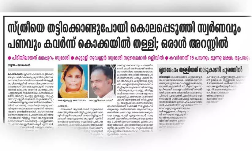 പണവും സ്വർണവും കൈക്കലാക്കുകയായിരുന്നു ലക്ഷ്യം. കഴിഞ്ഞ ഏഴിന് മൊഫ്യൂസിൽ സ്റ്റാൻഡിൽനിന്ന് സ്ത്രീയെ കാറിൽ കയറ്റിക്കൊണ്ടുപോവുകയായിരുന്നു. മുക്കം ഭാഗത്ത് എത്തിയപ്പോൾ ഷാൾ കഴുത്തിൽ മുറുക്കി കൊല നടത്തി. കാറോടിച്ച സുലൈമാനും ഷാൾ കുരുക്കാൻ കൂട്ടുകൂടി. തുടർന്ന് വഴിക്കടവ് വഴി നാടുകാണി ചുരത്തിലെത്തി സൈനബയുടെ ഫോൺ സ്വിച്ച് ഓഫാക്കി.