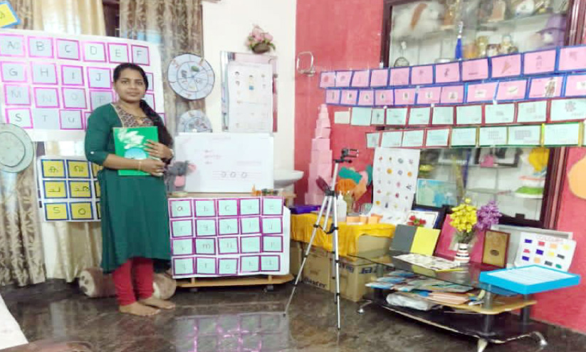 ചുമരുകൾ മുഴുവൻ അക്ഷരമാലകളും ഗണിത പഠന സഹായികളും പതിച്ചു. ഓരോ അക്ഷരത്തിനുമനുസരിച്ച് വ്യത്യസ്ത രൂപങ്ങൾ തയാറാക്കി. ആനയും ആപ്പിളും രൂപങ്ങളിലൊരുക്കുക മാത്രമല്ല പലതിെൻറയും ചെറുതും വലുതുമായ ഇനങ്ങളും സംഘടിപ്പിച്ചിട്ടുണ്ട്. 10 മാസം പ്രായമുള്ള മകൻ ധനിൻ കൃഷ്ണയുടെ കുസൃതി ഭയന്ന് ചുവരിൽ കുറച്ച് ഉയരത്തിലാണ് ചിത്രപ്പണികൾ. ക്ലാസ് വിഡിയോകൾ രക്ഷിതാക്കളുടെ വാട്സ്ആപിൽ അയച്ച് കൊടുക്കും. വിരസതയും മടിയും മാറി ക്ലാസ് ശ്രദ്ധിക്കാൻ ആകർഷണീയമായ ഈ പശ്ചാത്തലം ഏറെ ഉപകാരപ്പെടുന്നതായി രക്ഷിതാക്കളും പറയുന്നു. കുട്ടികൾതന്നെ കളിക്കോപ്പുകളും പഠന സഹായികളുമൊരുക്കി ടീച്ചറെ അനുകരിക്കുന്നുണ്ട്.