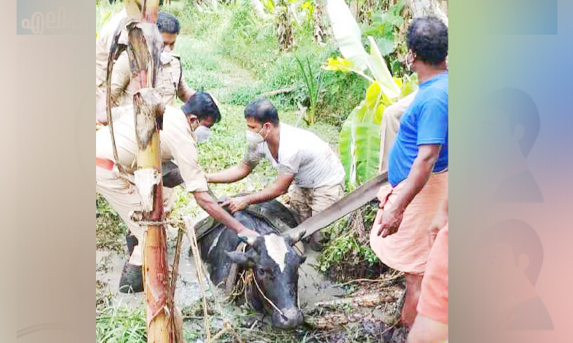 വയലിലെ ചളിയിൽ താഴ്ന്ന പശുവിനെ അഗ്നിശമനസേന രക്ഷിച്ചു