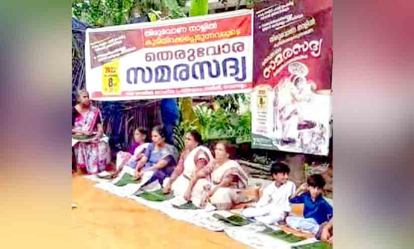 ചേമഞ്ചേരി: സിൽവർ ലൈൻ പദ്ധതി പിൻവലിക്കുക, സമരഭടന്മാർക്കെതിരായ കേസുകൾ പിൻവലിക്കുക എന്നീ ആവശ്യങ്ങളുന്നയിച്ച് കാട്ടിലപ്പീടിക ജനകീയ പ്രതിരോധ സമരസമിതിയുടെ ആഭിമുഖ്യത്തിൽ തിരുവോണത്തിന് തെരുവോര സമരസദ്യ നടത്തി.